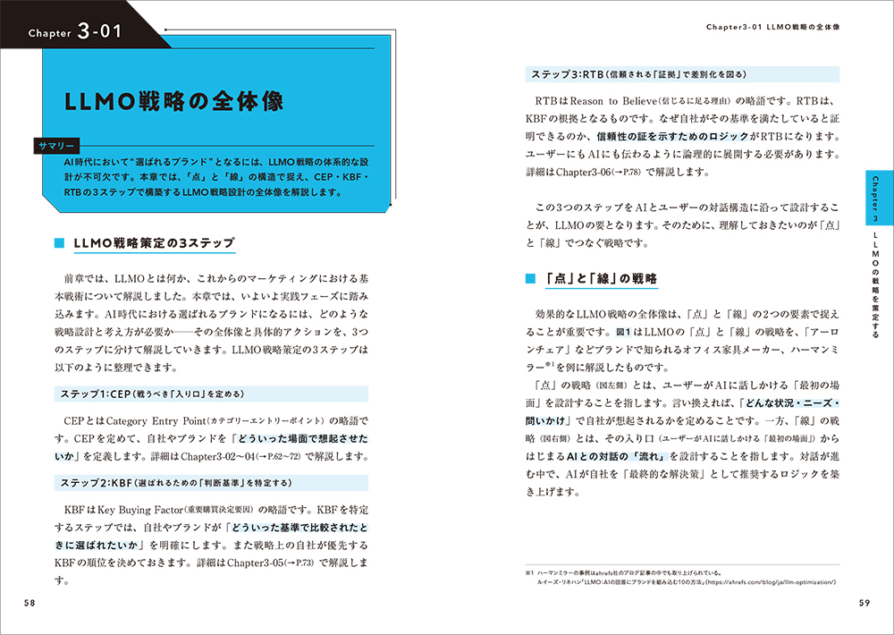 Chapter3では、CEP・KBF・RTBという3つの構成要素を軸に、LLMO戦略の全体像を解説。