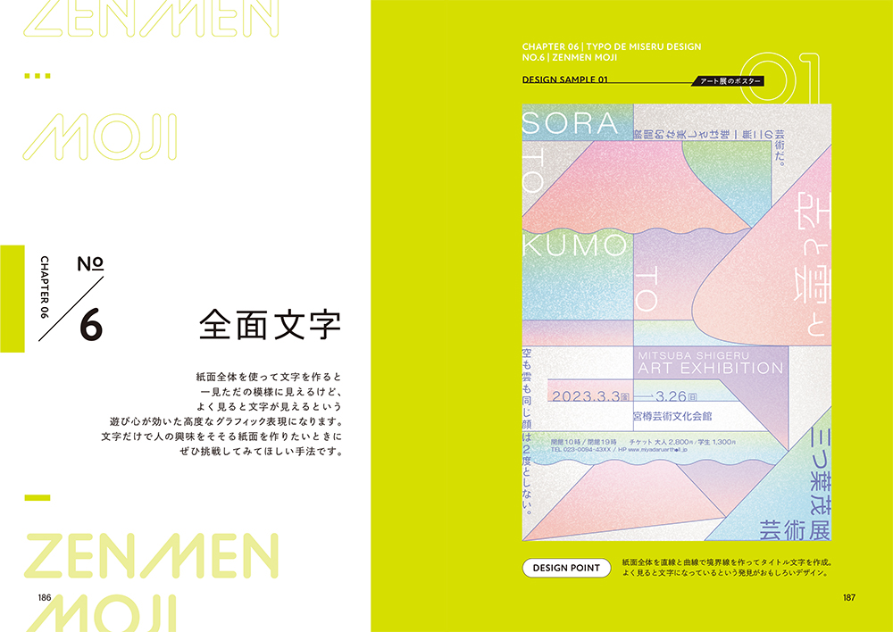 「あるあるタイポ。誰でもできる文字加工のデザイン集」では、文字加工された「タイポグラフィ」や「作字」が、どのように「ポスター」や「バナー」などのデザイン制作物に活かせるのかがわかりやすいように、デザイン作例をたくさん紹介している。