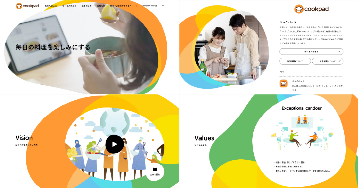 ミッションやビジョンだけではなく、今まで対外的に公開することが少なかったTruths(事業の考え方)やValues(個人の行動規範)も合わせて伝えることで、クックパッドが目指す世界と、その実現に向けてどのように考えで事業に取り組んでいるかを紹介している。