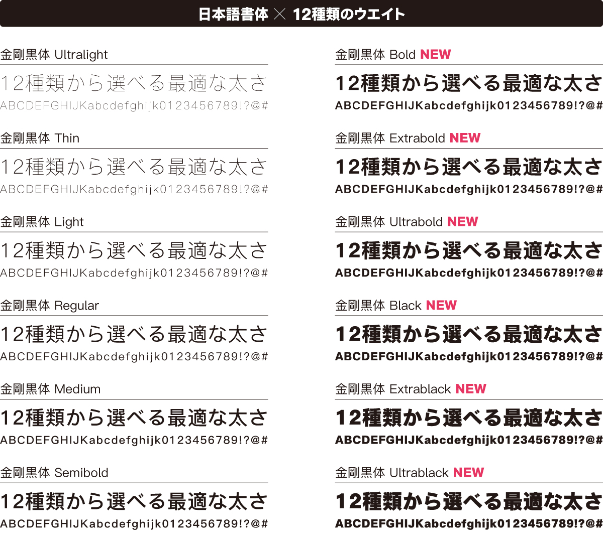 ▼「金剛黒体」日本語書体×12種類のウエイト