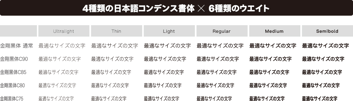 ▼「金剛黒体」4種類の横幅×6種類のウエイト