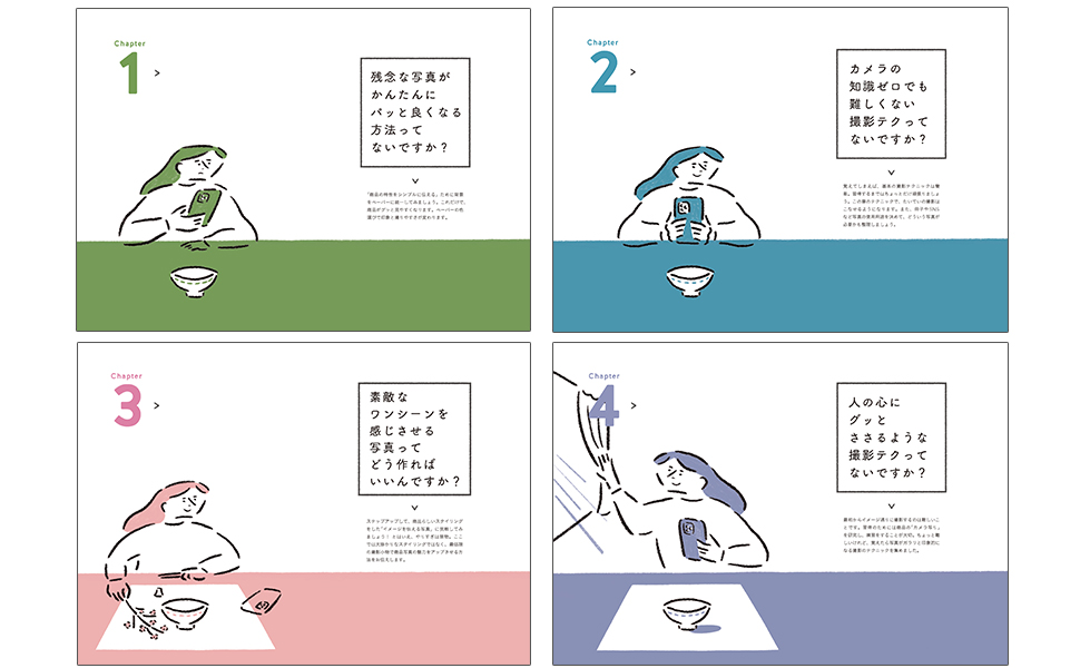 「すみません 素人でも仕事の写真を上手に撮影する方法ってないですか? できればスマホで」は撮影初心者が特別な機材を使わずスマホ1台で、商品の魅力が伝わる写真が撮れることに特化した1冊。Chapter1では背景紙1枚でシンプルに綺麗な商品写真を撮影する方法、Chapter2では基本の撮影テクニックを紹介しており、撮影に苦手意識のある人でも、まずはこの2章をマスターすればOKな内容になっている。
