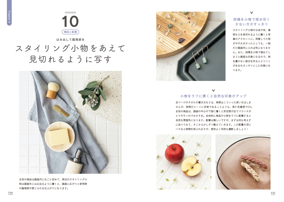 さらに、Chapter3では小物1~2個からトライできる簡単なスタイリング写真の撮り方、Chapter4では光やボケを使った印象的な写真の撮影方法などを紹介しており、顧客の心をつかむための、世界観のある写真にもチャレンジできる内容となっている。