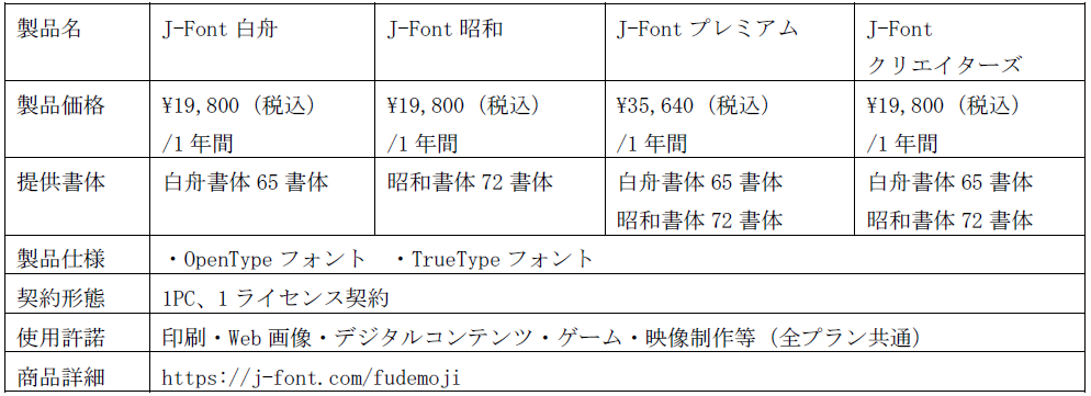 そこでこれまで提供してきた「J-Font白舟」プランに加えて、年間19,800円(税込)の「J-Font昭和」プランおよび2大筆文字メーカーがお得な価格で利用できる「J-Fontプレミアム」各プランを追加。