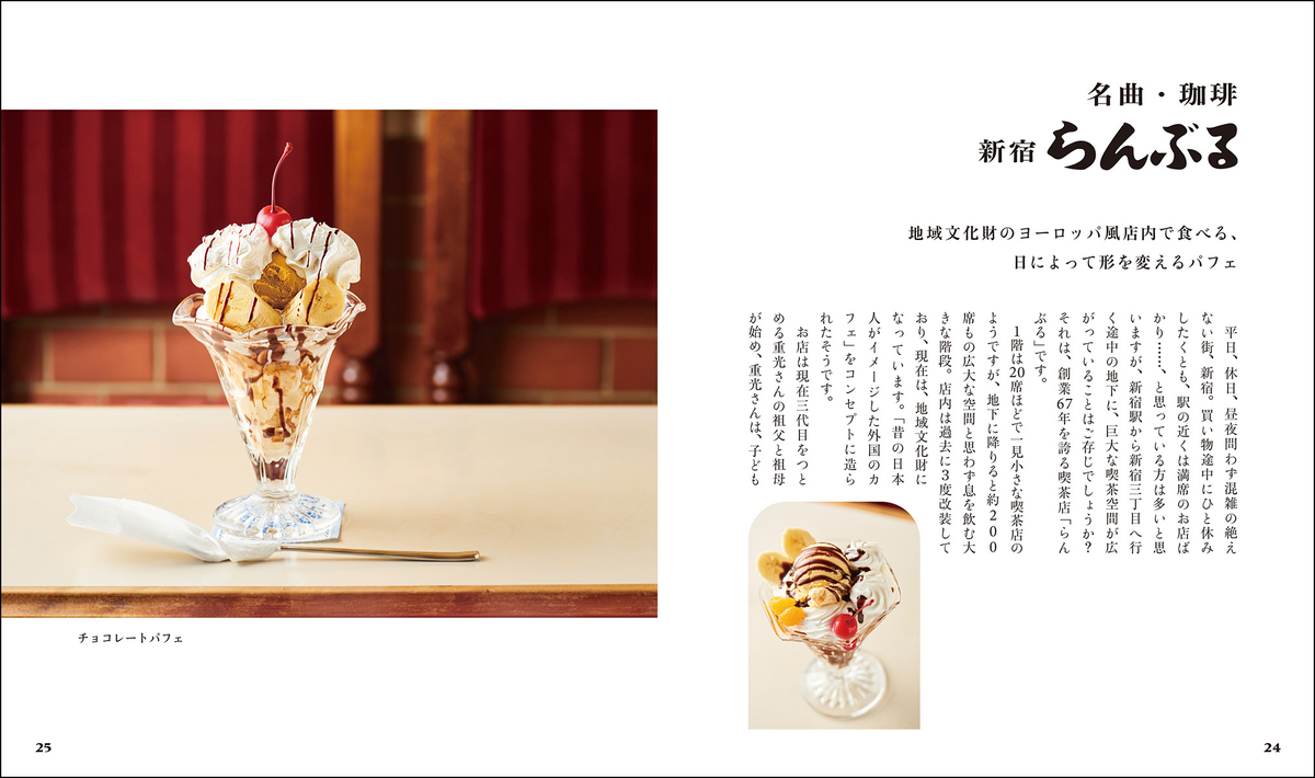 パフェ、ゼリー、プリン、トースト、ホットケーキ、飲み物など、あまいものを切り口に、東京近郊にある名喫茶30店を紹介。